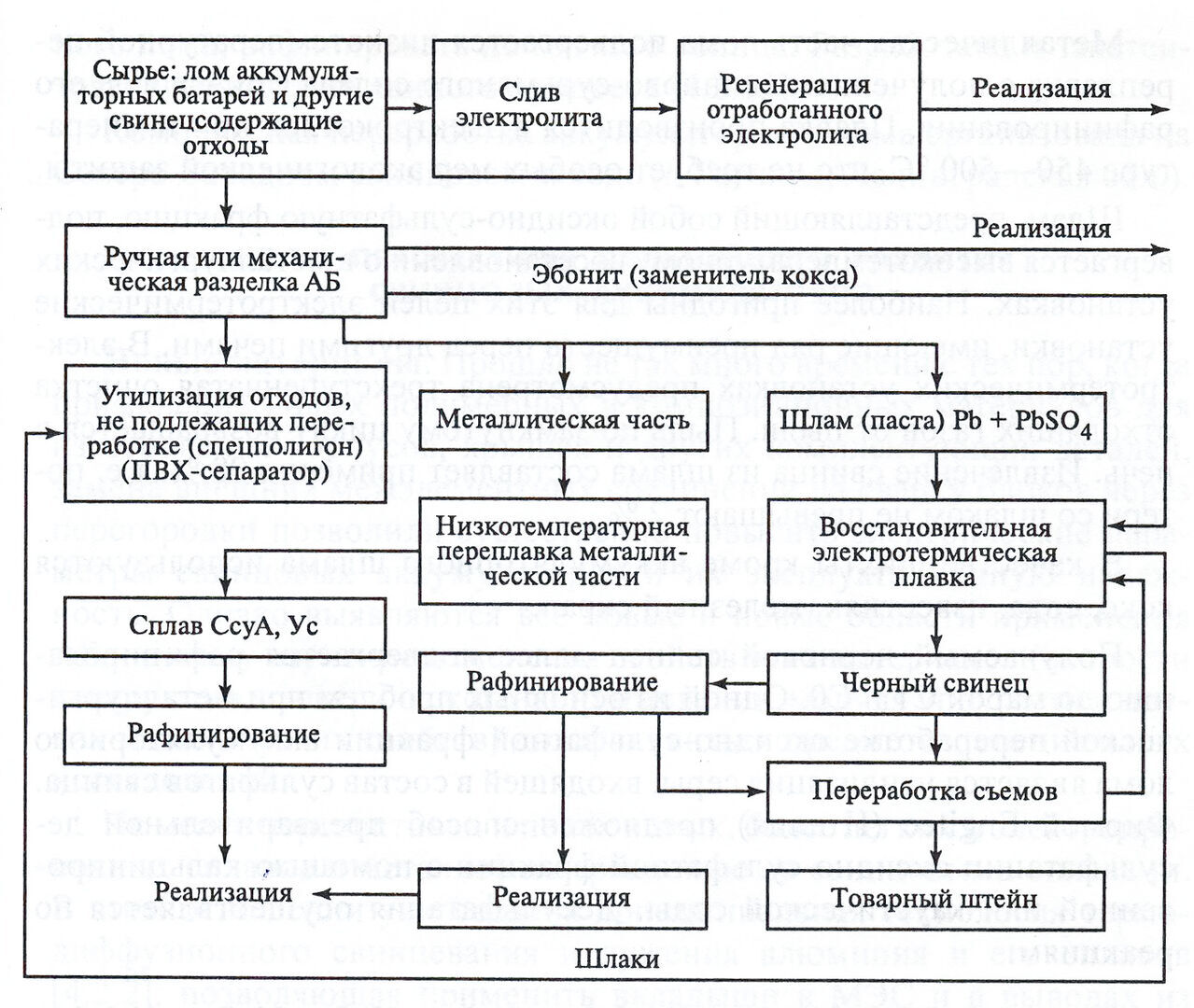 Существуют различные подходы к выбору технологической схемы переработки, а именно: восстановительная плавка неразделанного лома или плавка с предварительной разделкой на отдельные составляющие (металлическая часть, оксидно-сульфатная фракция, пластмасса, эбонит и сепараторы).